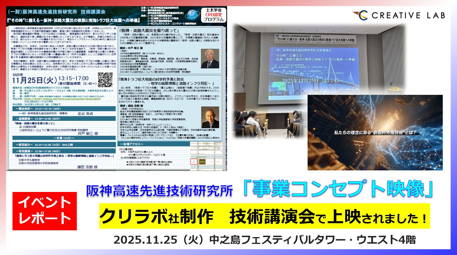 このたび、クリエイティブ・ラボ社は一般財団法人阪神高速先進技術研究所の事業コンセプト映像を制作し、2025年11⽉25⽇(火)に中之島フェスティバルタワー・ウエスト4階「中之島会館」にて開催された「技術講演会」にて上映されました。