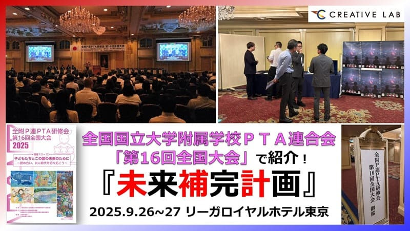 このたび、未来補完計画プロジェクトに後援いただいている一般社団法人全国国立大学附属学校PTA連合会(略称「全附P連」)にお声がけいただき、2025年9⽉26⽇(金)、27日(土)にリーガロイヤルホテル東京にて開催された「全附P連PTA研修会 第16回全国大会」にて「未来補完計画プロジェクト」が紹介されました。