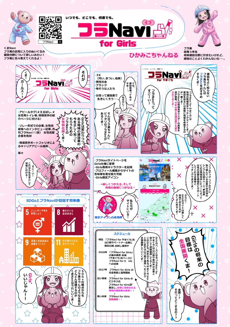 地域の建設業では、根強く残るブラック・3K・男社会等の負のイメージを払拭し、女性技術者の確保→育成→活躍の流れを加速させることが急務の課題です。本提案では、実体験を基に女子学生が考案し、お試し運用中の現場見学総合情報サイト『フラNavi for やまぐち』を女性ユーザーに特化した『フラNavi for Girls』に改修します。