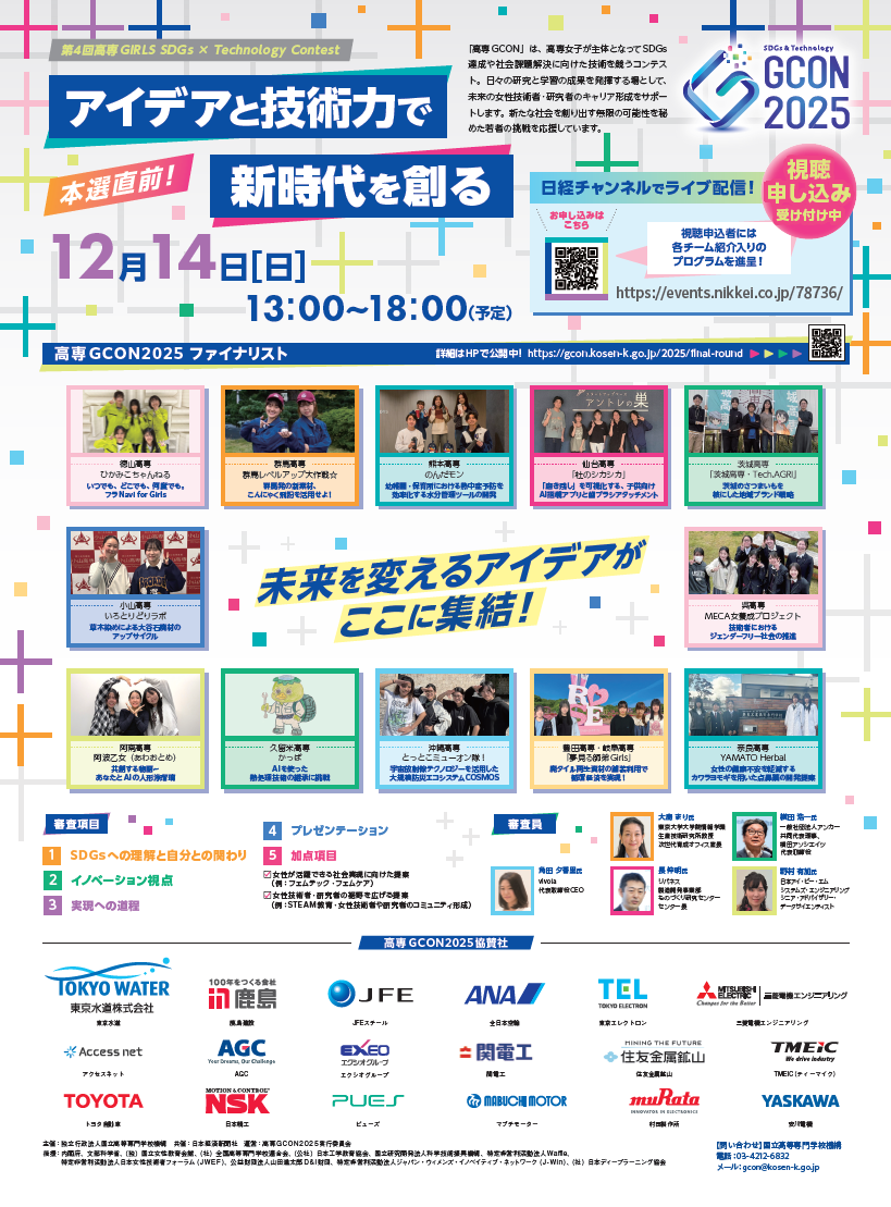 本コンテストは、女子高専生を中心としたチームが、SDGsの視点で日頃の学習や研究の成果を基に社会課題解決の技術開発・活動・アイデアを提案することにより、未来の研究者・技術者としてさらなる成長を促し、コンテストの発信を通じて日本の女性技術者・研究者を増やすことへの喚起を図ってまいります。