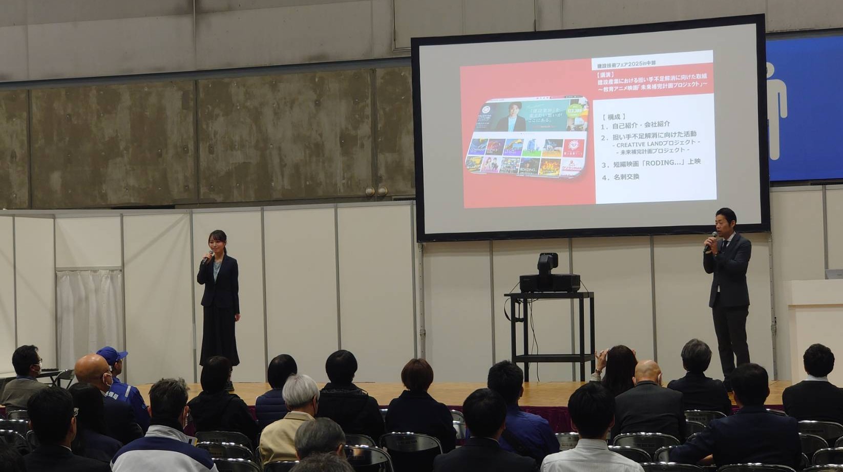 2日目12月5日(金)11:00から第3展示館でクリエイティブ・ラボ社岡野と安井南が「短編映画『ROADING...』上映会&建設産業のPR戦略」と題して、登壇しました!
