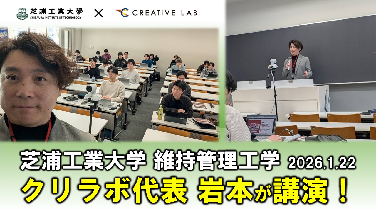 CREATIVE LANDプロジェクトの活動にご助言、ご協力いただいている芝浦工業大学伊代田教授にお声がけいただき、2026年1月22日(木)に「維持管理工学」の講義内にて、クリエイティブ・ラボ代表岩本が講演を行いました。