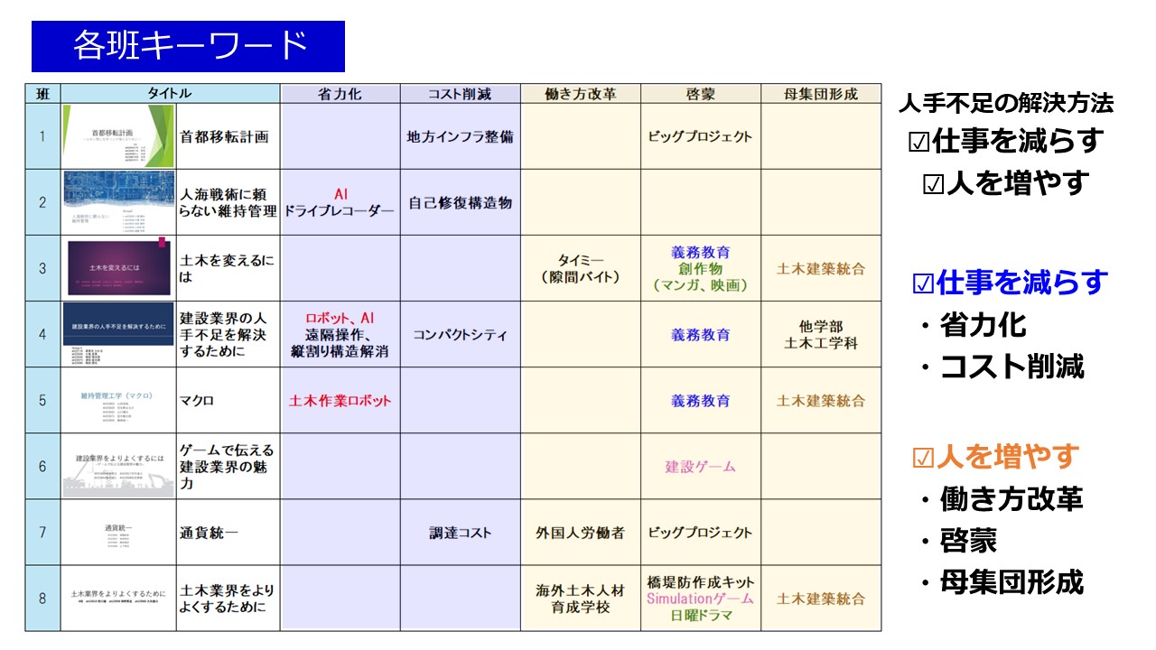 学生が8班に分かれ、建設業界の人手不足を解消するために考え、発表されたアイデア・提案をキーワード分析。