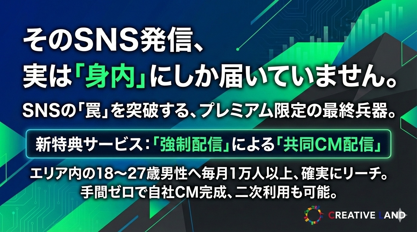 このたび、CREATIVE LANDプロジェクトのプレミアム協賛企業限定の新特典サービス『SNS共同CM配信』を2026年2月よりスタートしますので、ご案内します。