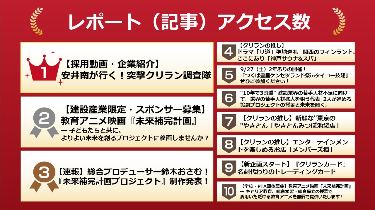 建設産業の魅力を発信するエンタメ系建設情報総合サイト「CREATIVE LAND」について、2025年度(2025年4月1日~2026年3月31日)1年間の各コンテンツに掲載されているページのアクセス数を収集しましたので、年間ランキングを『CREATIVE LANDアクセスアワード2026』として発表します。