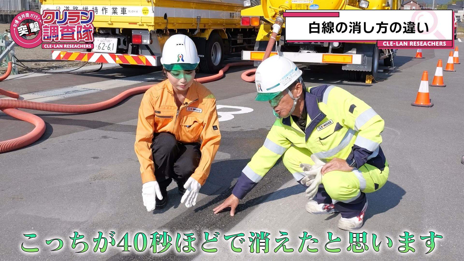 従来工法である路面を削る方法と、路面への影響も少なく、環境に優しいウォータジェットの抹消方法を実演して比較しました。