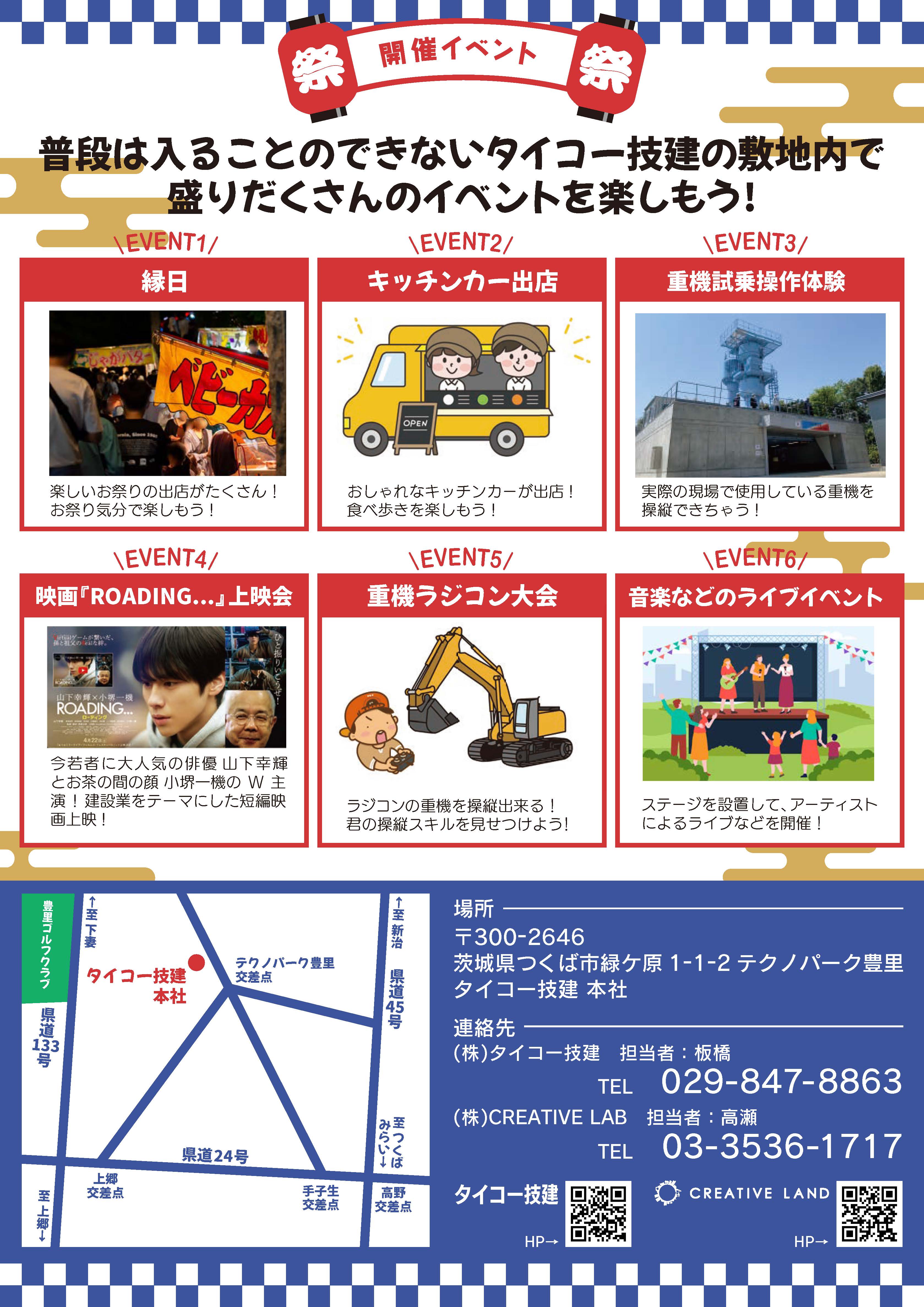 地域住民の皆さまを招待し、ステージイベントや重機ラジコン大会、重機の操作&試乗体験、音楽ライブや映画を楽しむお祭りです。