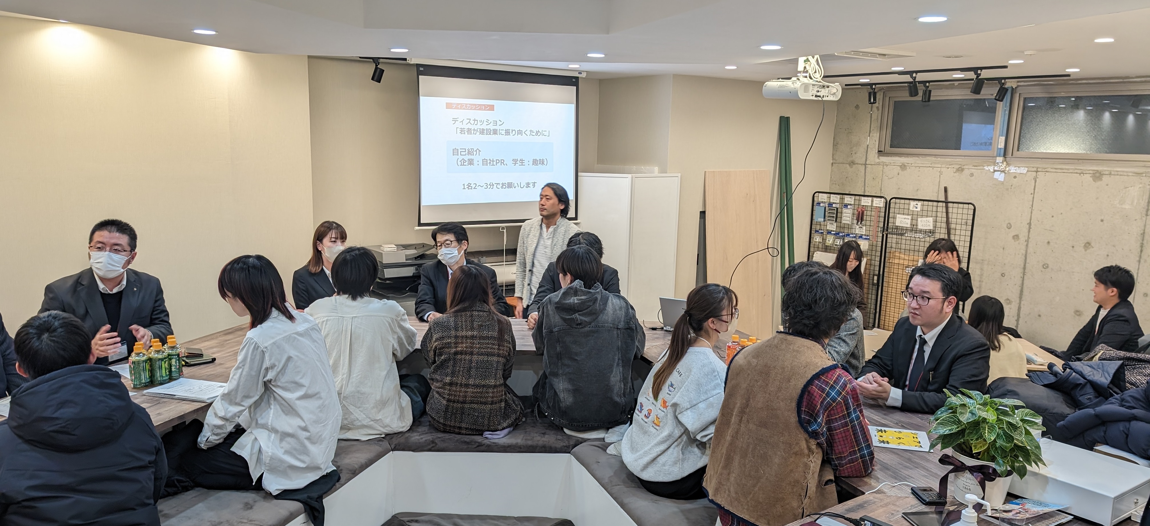 はじめに、自分が建設業を志したキッカケから話をはじめ、どういうキッカケがあれば、建設業に魅力を感じるかなど、色々なアイデアや意見交換ができました。