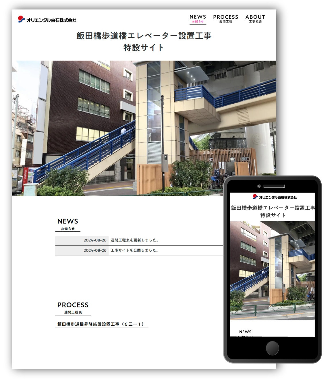 東京都の飯田橋駅近傍の歩道橋のバリアフリー化を目的としたエレベーター設置工事の現場紹介ホームページを制作しました。