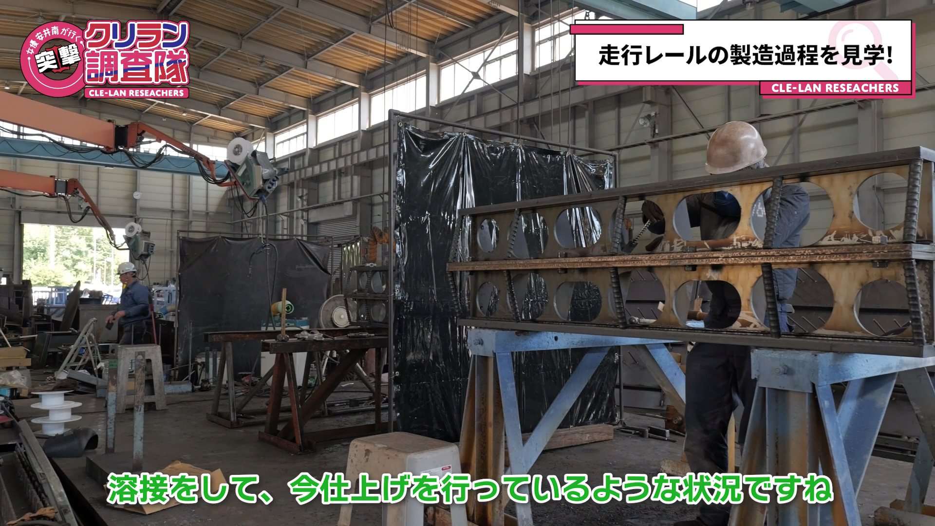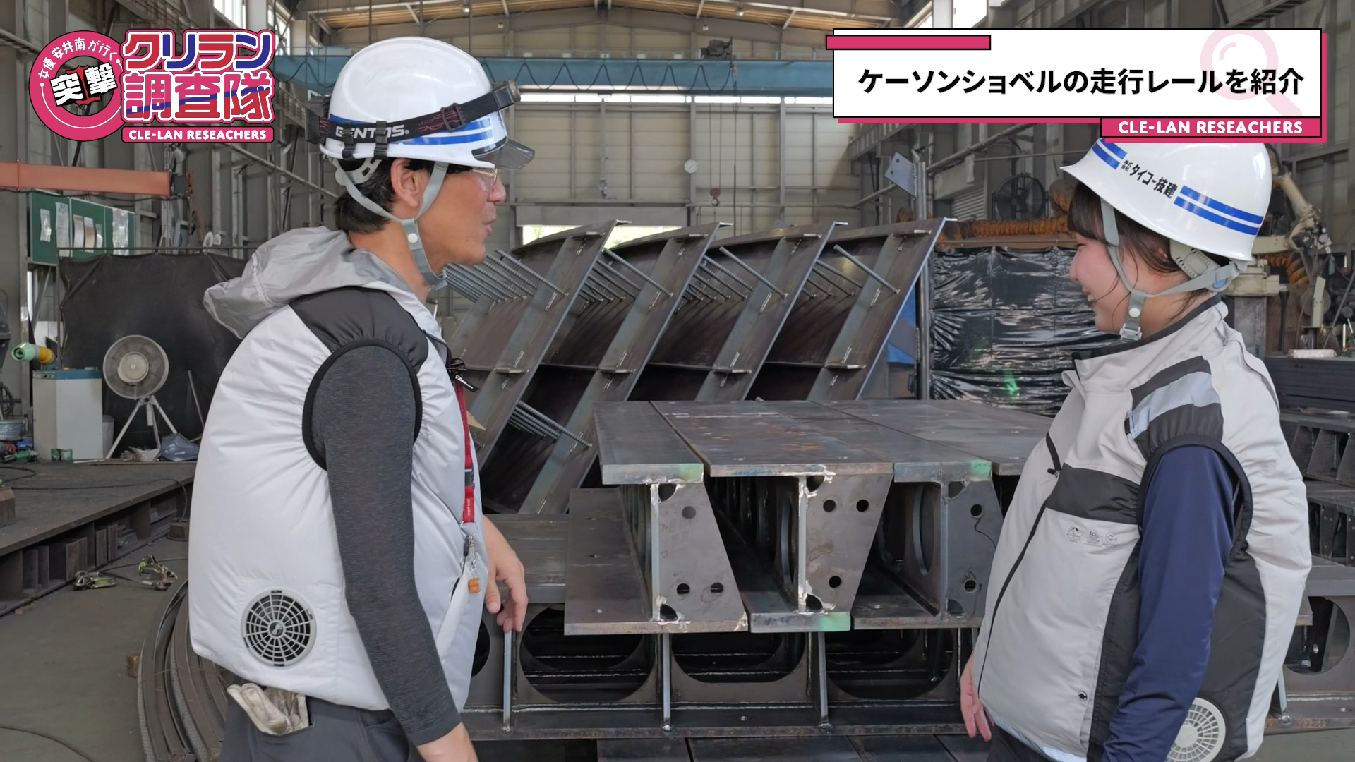 まずは機材の製作を行なっている製造工場を、担当者の奥芝さんにご案内いただきました。製造工場ではニューマチックケーソン工法で使われる天井走行型のケーソンショベルの走行レールの製造過程を見学させていただきました。
