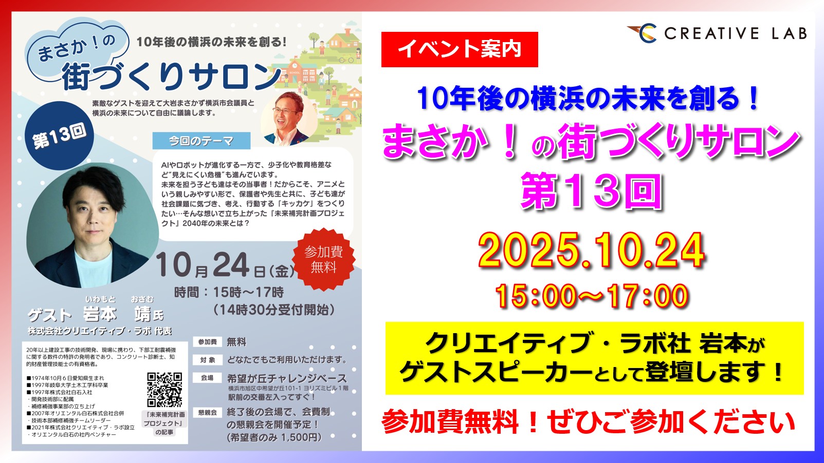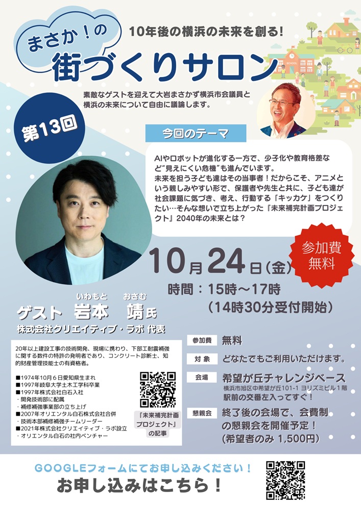 このたび、株式会社クリエイティブ・ラボの代表岩本が、大岩まさかず横浜市会議員からお声かけいただき、2025年10月24日(金)に希望が丘チャレンジベースにて開催される「10年後の横浜の未来を創る! まさか!の街づくりサロン第13回」に登壇します。