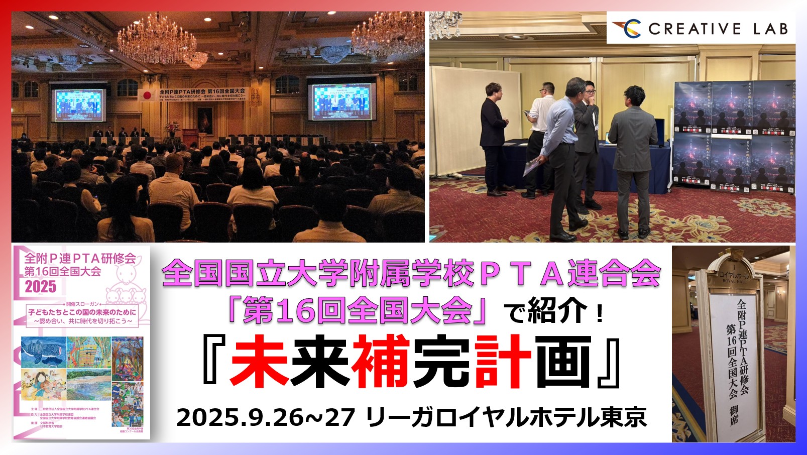 このたび、未来補完計画プロジェクトに後援いただいている一般社団法人全国国立大学附属学校PTA連合会(略称「全附P連」)にお声がけいただき、2025年9⽉26⽇(金)27日(土)にリーガロイヤルホテル東京にて開催された「全附P連PTA研修会 第16回全国大会」にて「未来補完計画プロジェクト」が紹介されました。