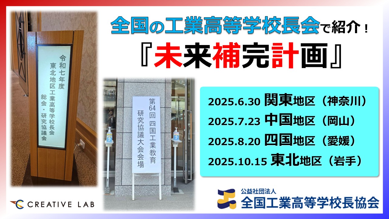 公益社団法人全国工業高等学校長協会にお声がけいただき、全国の総会や研究協議会の機会にて「未来補完計画プロジェクト」を紹介させていただいています。