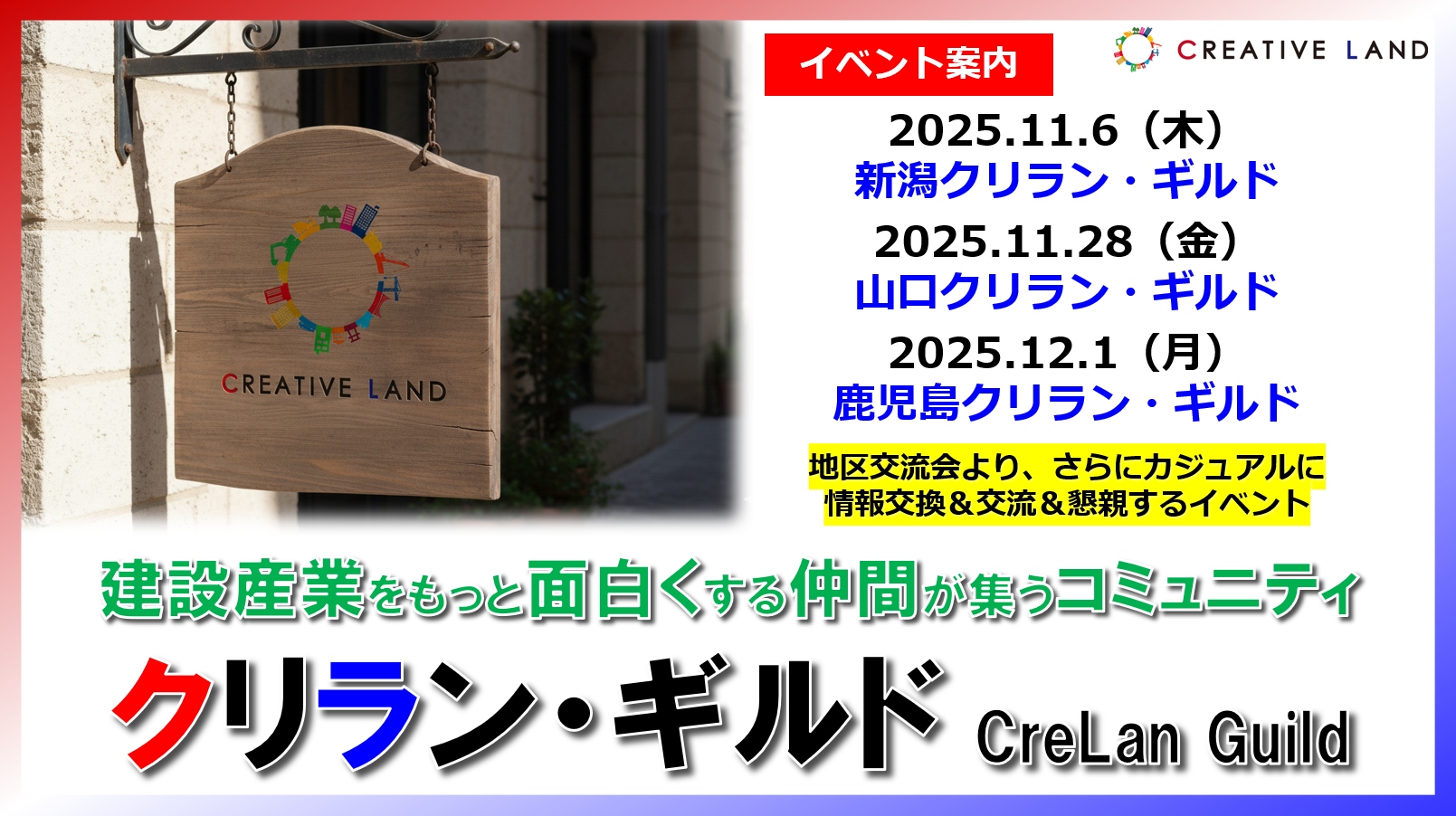 このたび、CREATIVE LAND協賛企業の皆さんと交流できる新イベント『クリラン・ギルド』を2025年11月6日(木)に新潟県、2025年11月28日(金)に山口県、2025年12月1日(月)に鹿児島県で開催いたしますのでご案内いたします。