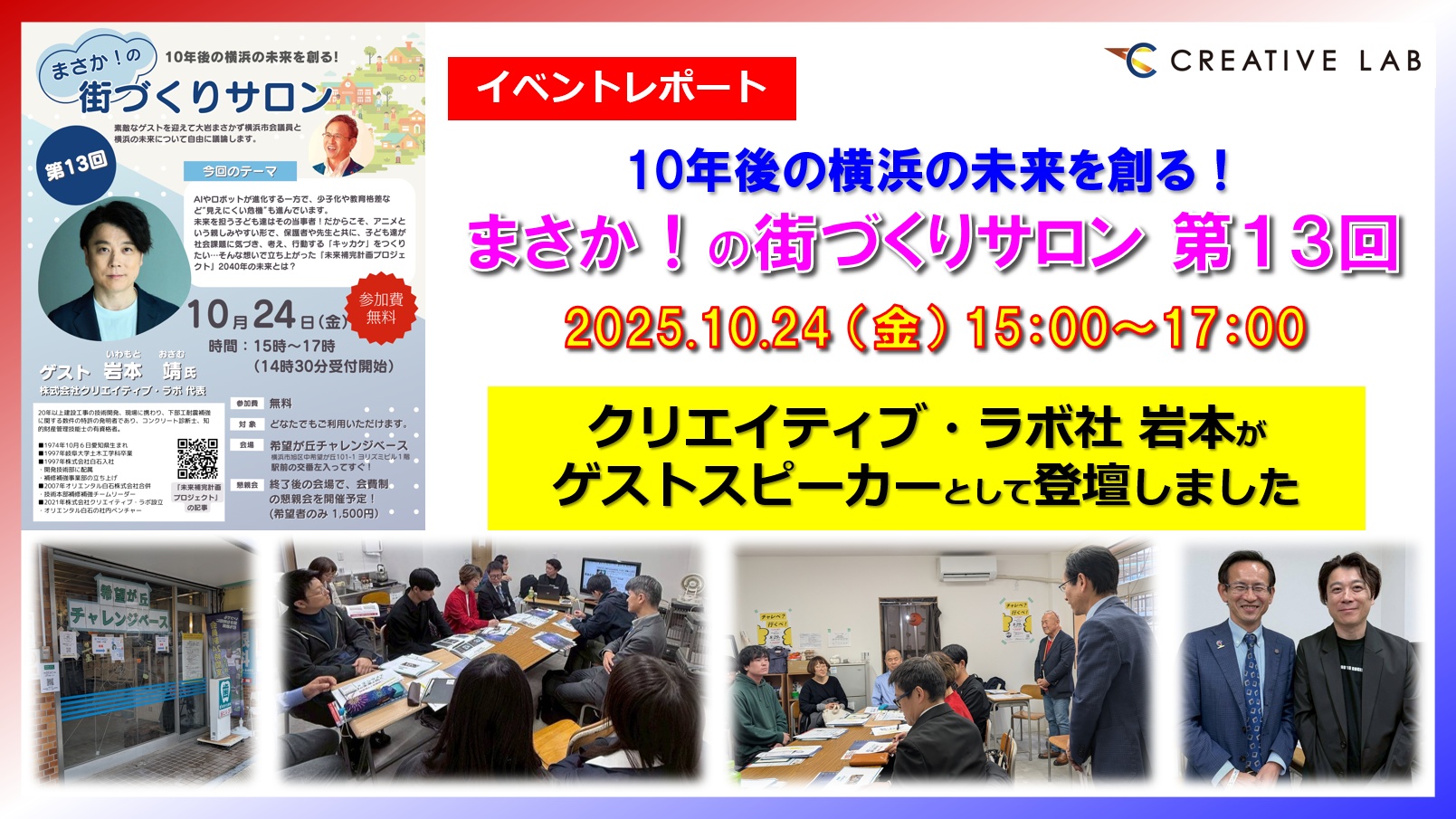 このたび、株式会社クリエイティブ・ラボの代表岩本が、大岩まさかず横浜市会議員からお声かけいただき、2025年10月24日(金)に希望が丘チャレンジベースにて開催される「10年後の横浜の未来を創る! まさか!の街づくりサロン第13回」に登壇しました。