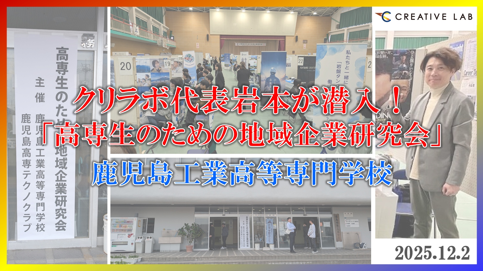 このたび、株式会社クリエイティブ・ラボ代表岩本が、鹿児島で初開催された鹿児島クリラン・ギルドの翌日2025年12月2日(火)に霧島市隼人体育館で開催された鹿児島工業高等専門学校主催「高専生のための地域企業研究会」に潜入しましたので、当日のイベントレポートをお送りします。