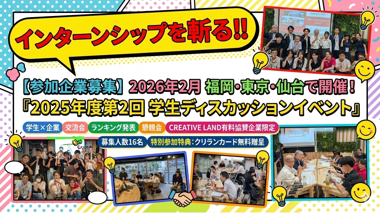 【参加企業募集】2026年2月 福岡・東京・仙台で開催!インターンシップを斬る‼『2025年度第2回 学生ディスカッションイベント』
