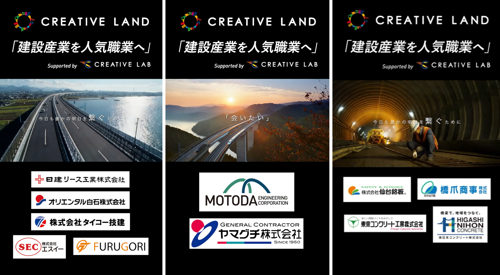 クリエイティブ・ラボが制作する建設業界の魅力を伝える様々な表現のCMの最後に、貴社の社名・ロゴを挿入 。