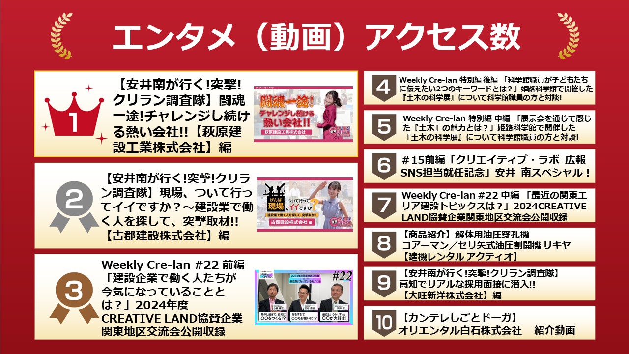 建設産業の魅力を発信するエンタメ系建設情報総合サイト「CREATIVE LAND」について、2025年度(2025年4月1日~2026年3月31日)1年間の各コンテンツに掲載されているページのアクセス数を収集しましたので、年間ランキングを『CREATIVE LANDアクセスアワード2026』として発表します。