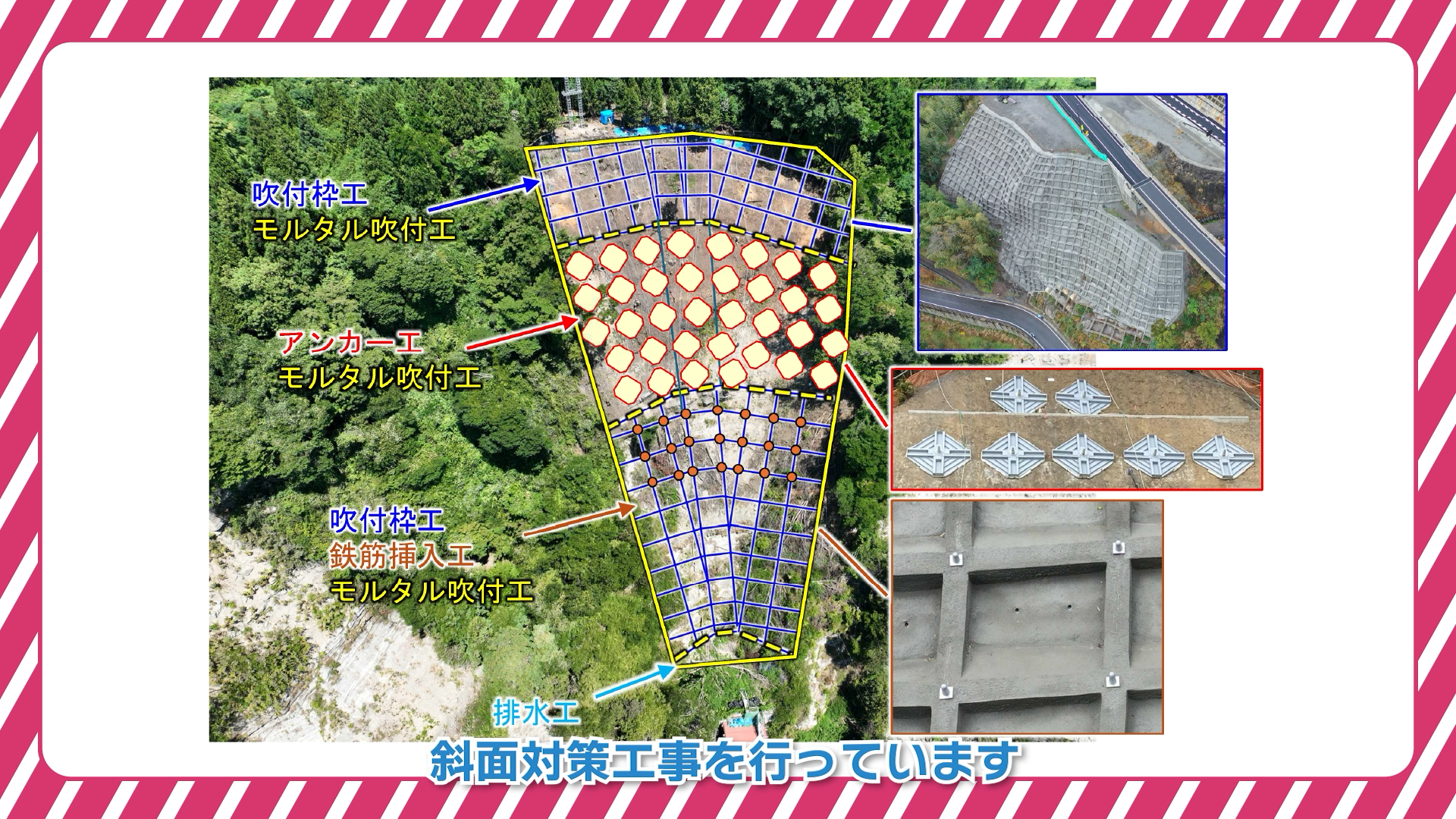 災害によって、トンネル上部の斜面が崩れてしまっており、本工事ではその斜面の対策工事を行っています。